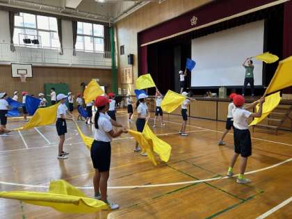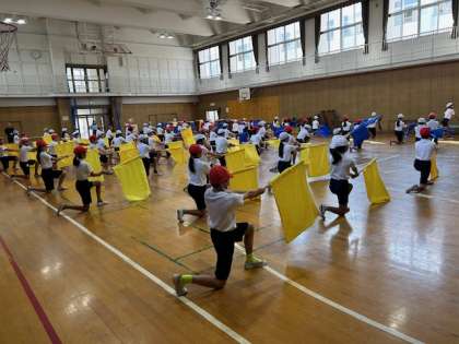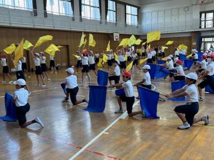 6年生が体育館で運動会の団体演技の練習をしました。ブラック(旗)を持ち、音楽に合わせてブラックの振り付けを覚えいます。6年生にとって小学校生活最後の運動会です。がんばりましょう。