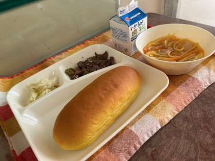 献立は、牛肉の香味焼き、トマトのスープスパゲッティ、キャベツのサワーソテー、パンプキンパン、牛乳です。