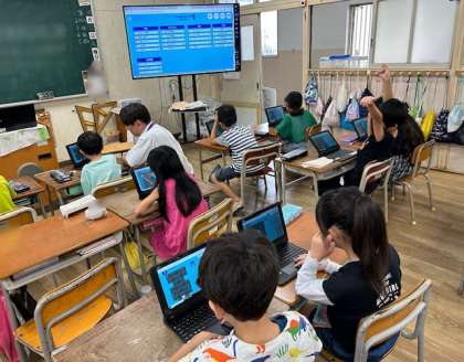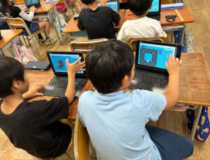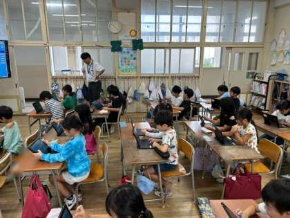 2年生がICT支援員さんからプログラミングを教えてもらいました。まっすぐに移動、右に移動、ななめに移動などを使って、ロボットを動かしました。子どもたちは覚えるのが早くて、驚きです。
