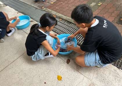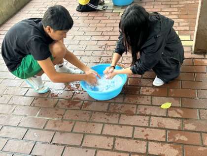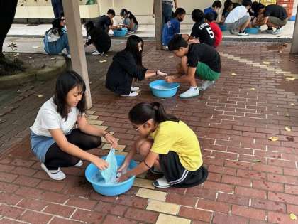6年生が家庭科で洗濯の学習をしました。たらいに洗剤を入れ、ハンカチを手もみ洗いしました。きれいに洗えたかなあ。