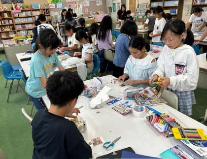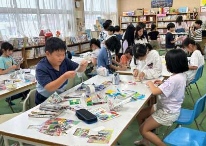 月曜日と火曜日に図書館まつりを行っています。図書館ボランティアの皆さんが、子どもたちにしおり作りを教えてくれています。牛乳パックをしおりの大きさに切り、本から切り取ったイラストを貼り付けて完成です。読書の秋にふさわしい取り組みです。