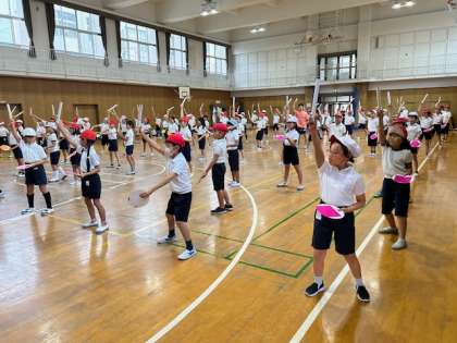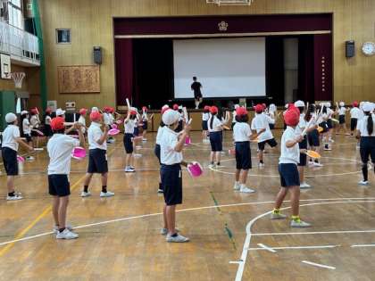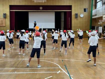 4年生が運動会の団体演技の練習をしました。画用紙で作ったパーランク(太鼓)とバチを持って、エイサーを踊りました。踊りとパーランクの音がそろってきています。