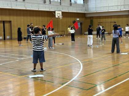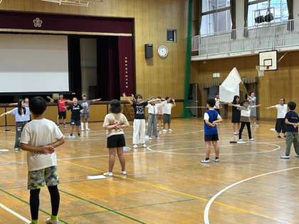 運動会で応援合戦をします。赤組白組の応援団が応援の練習をしました。太鼓を鳴らし、旗をふり、大きな声で応援をがんばっています。