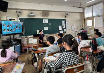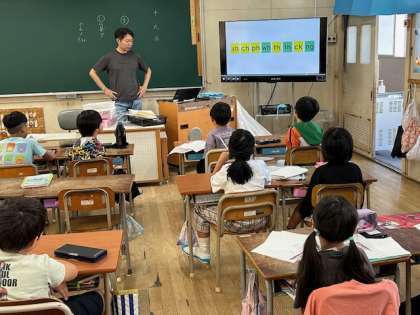 2年生と4年生のイングリッシュタイムです。英語を聴いて、声を出しています。4年生は月の言い方を覚えました。