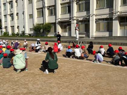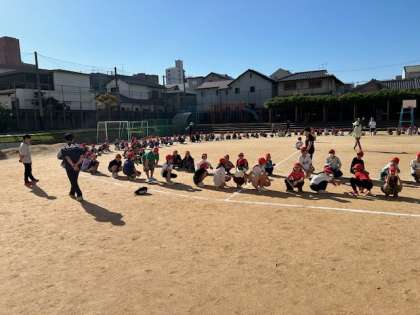 今回の運動会で初めて行う競技です。1年から4年生は大玉を転がし、5、6年生からは頭上に大玉をのせ運びます。紅白対抗で2回行います。児童会から運動会のめあてが発表されました。