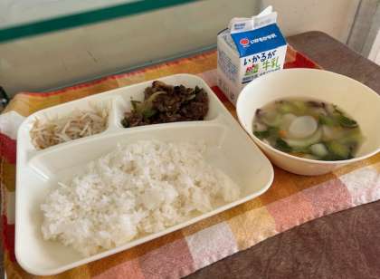 献立は、プルコギ、トック、もやしのナルム、ご飯、牛乳です。