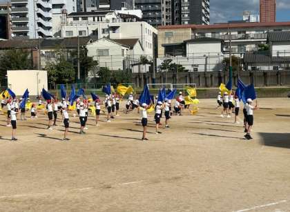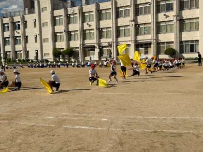 6年生が運動場で運動会の団体演技「ブラック」の練習をしました。今日は隊形移動の仕方を練習しました。体育館での練習と違ってブラックを大きく振ることができました。