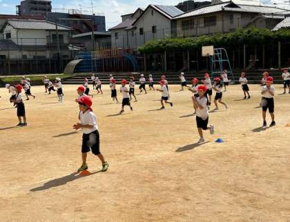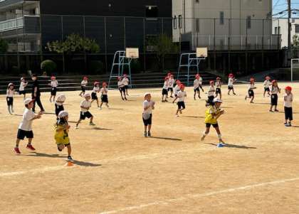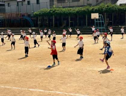 1年生が秋の青空が広がるなか、運動場で運動会のダンスの練習しました。演技をする場所を覚え、楽しく踊ることができました。