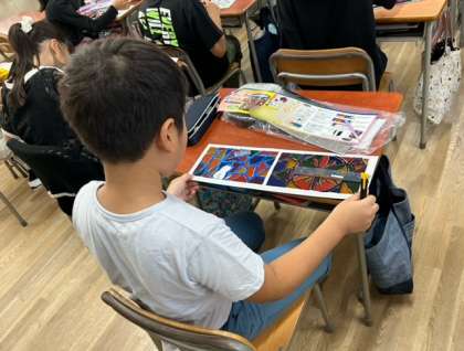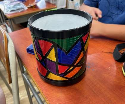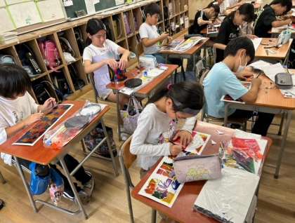 5年生がステンドグラスで小物入れを作っています。カッターナイフで丁寧に切り取り、セロハンを貼り付けました。光をはねかえす美しい作品に仕上がっています。