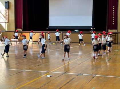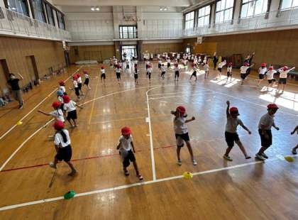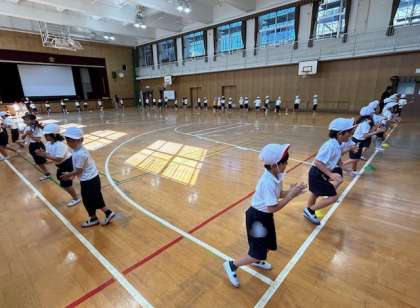 ? 体育館で運動会の団体演技の練習をしました。入場から退場まで通して練習しました。隊形移動もスムーズにできるようになり、仕上がってきています。運動会当日を楽しみにしてくださいす。