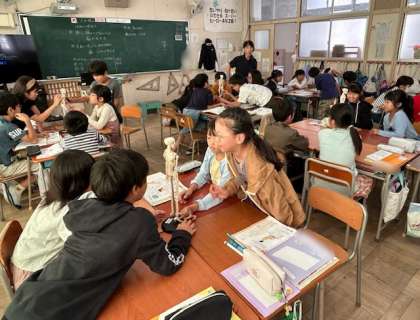 4年生が理科「ヒトの体のつくりと運動」を学習しています。今日は人の骨について調べました。人間の骨の模型を見ながら、頭、胸、背中、腰、足、腕、手、指、首の骨の様子を調べました。