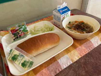 献立は、タンタンめん(肉みそ)、あっさりキャベツ、まめこんぶ、コッペパン、ソフトマーガリン、牛乳です。