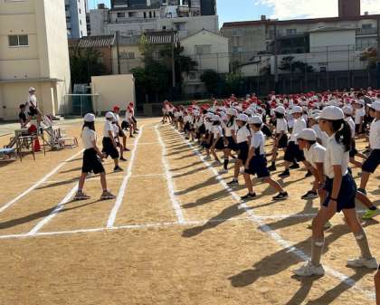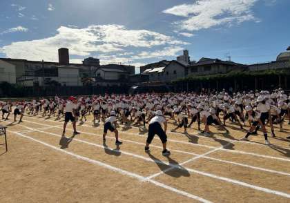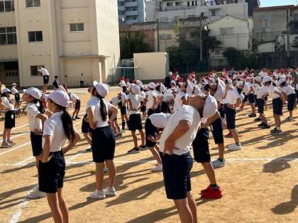 全体練習2日目です。まず、終わりの体操の練習をしました。集会委員会が担当です。全校児童の前に立ち、体をほぐす体操をしました。