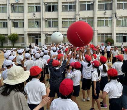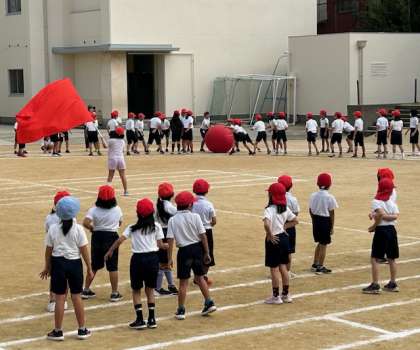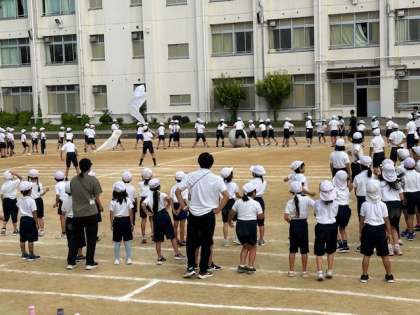 今年の運動会には、全校競技「大玉送り」があります。1年から4年生は大玉を転がし、その後5、6年生が頭の上で大玉を運びます。今日は引き分けでした。