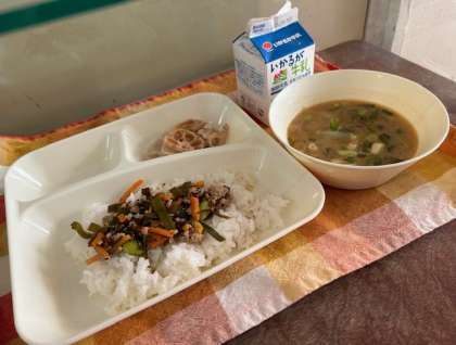 献立は、もずくと豚ひき肉のジューシー、さつまいものみそ汁、焼きれんこん、ご飯、牛乳です。