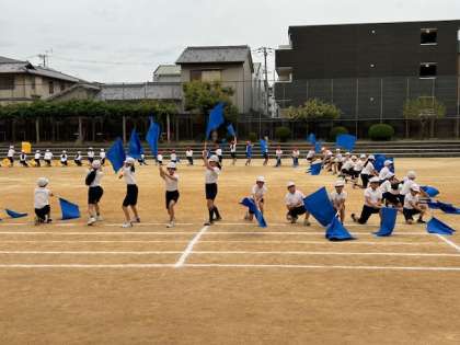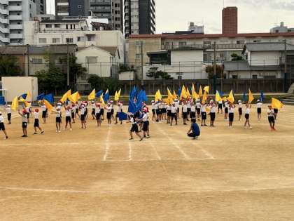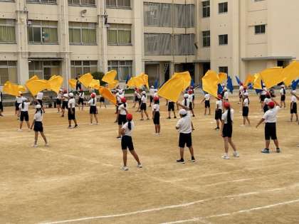 運動会の団体演技を通しで行いました。今日は新品のフラッグを使いました。
