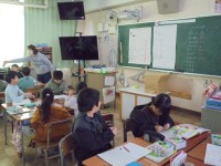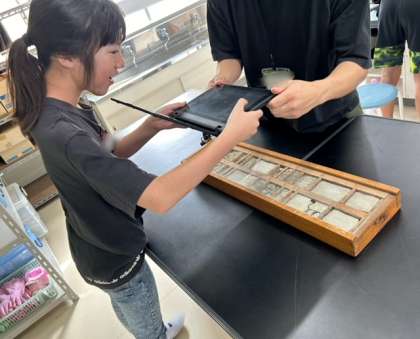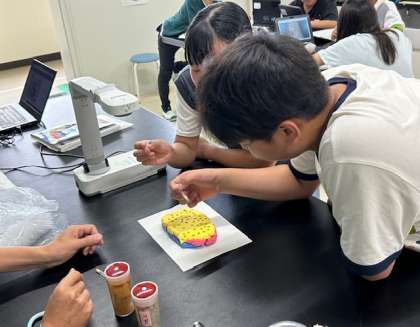6年生の理科は、大地のつくりと変化です。今日は地層の学習をしました。本校では、地面に穴を開けて地盤の状態を調べるボーリング調査をしています。地下20mまでの地層の様子を標本にしたものがあります。それをタブレット端末で撮影してワークシートにまとめました。また、青、赤、黄色の色粘土を使って3層の地層を作り、ストローを差し込んでボーリング調査体験をしました。