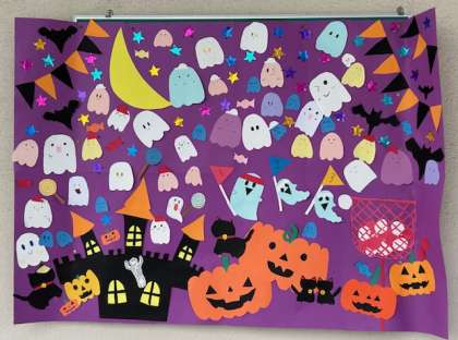 校内の掲示板にはハロウィンの掲示があります。もう10月も終わりですね。