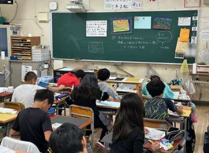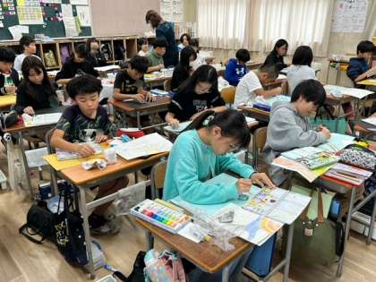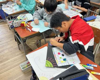 5年生が、アボリジナルアートに取り組んでいます。アボリニジアートは、ドットペイント(点描)で、生き物や自然を描きます。綿棒を使って根気よく点描で描いていきます。完成が楽しみです。