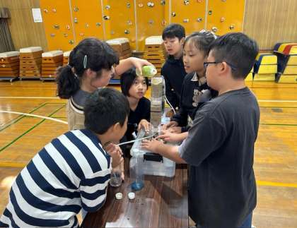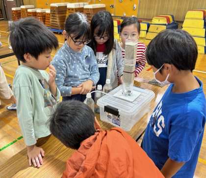 ペットボトルで作った実験装置に砂を入れ、そこに濁った水を入れると、濾過されてきれいな水が出てきました。子どもたちはびっくりです。楽しい実験ができました。