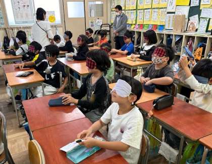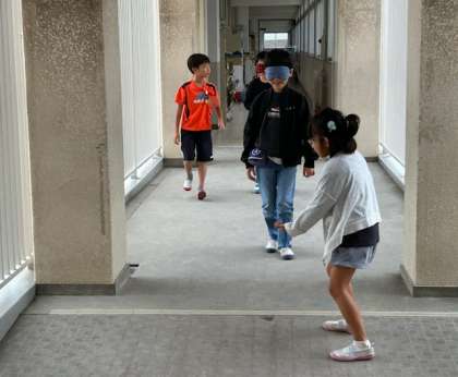 アイマスク体験をして、目が見えない人がどんな感じなのかを体験しました。アイマスクをして筆箱から鉛筆を出す、机の中から国語の教科書を出す体験をしました。その後、教室を出て廊下を歩き階段を下る体験をしました。