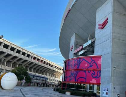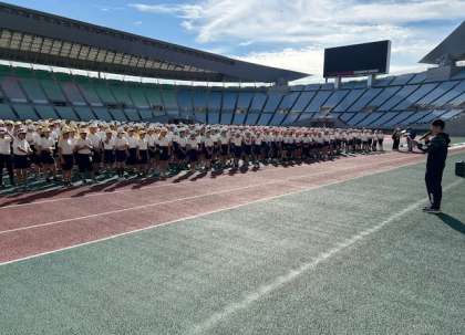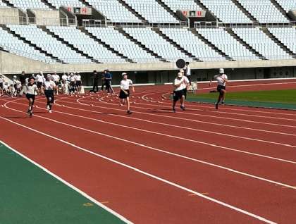 阿倍野区の6年生が集まり、ヤンマースタジアム長居でスポーツ交歓会をしました。100m走と400mリレーをしました。オリンピック選手が走った同じトラックを全力で走り抜きました。