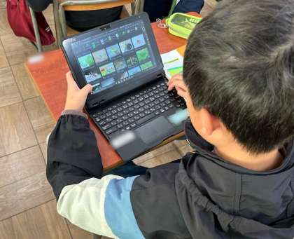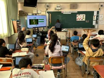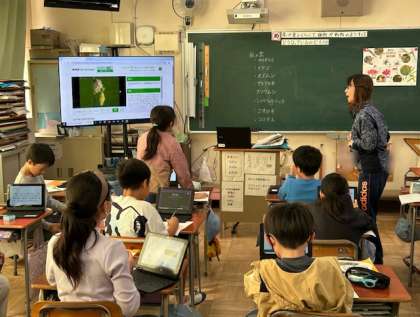 4年生の理科は、秋の虫をタブレット端末を使って調べ、発表しあいました。いろいろな秋の虫が出てきました。コオロギと間違いそうな名前のコロギスを見つけました。バッタのなかまでした。タブレット端末で調べると楽しいですね。