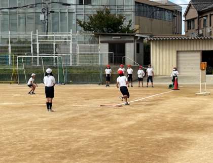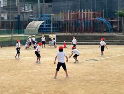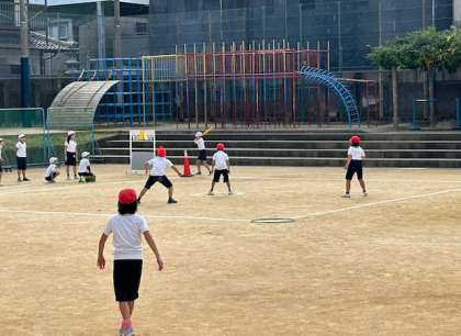 5年生がティーボールをしました。バッティングティーに載せたボールを打ちます。守備側はボールを取ったらピッチャープレート辺りのサークルにボールを戻します。誰でも打つことができる楽しいゲームです。
