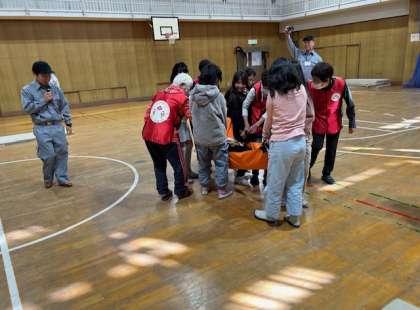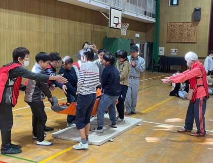 その後、代表児童が先生を担架で運ぶ体験をしました。女性防災グラフの皆さんに支援してもらいましたが、無事に運ぶことができました。担架で運ぶ時の注意事項を教えてもらいました。