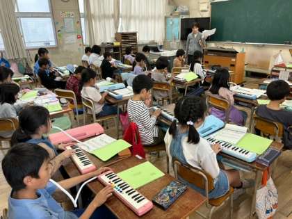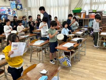 歌に合わせて、カスタネット、タンバリンをたたきました。また、鍵盤ハーモニカの演奏もしました。