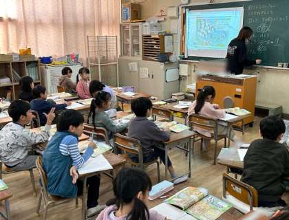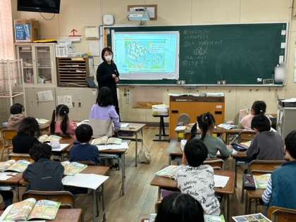 1年生の算数は、イラストを見て問題文を読んで、どんな式になるかを考えました。たし算かひき算か、答え方はどうすればよいかをみんなて考えました。