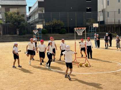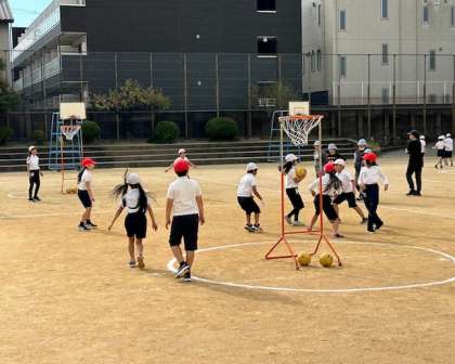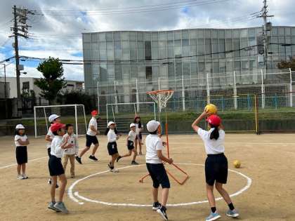 4年生の体育は、セストボールです。パスをつないでボールを運び、ゴールにシュートできるようになってきました。