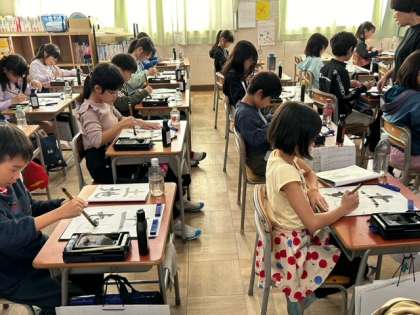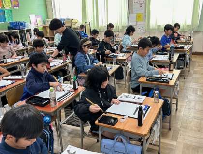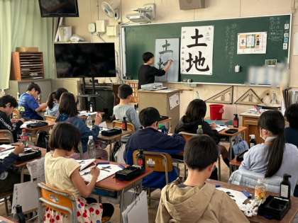 4年生が書道「大地」をしました。左右の部分の組み立て方に気をつけて書きました。