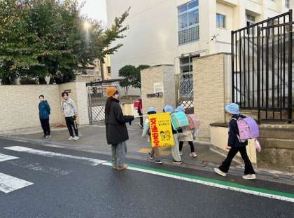 近隣の大学から学生さんが、登校指導のボランティアとして参加してくれています。子どもたちは照れながらにあいさつをしていました。