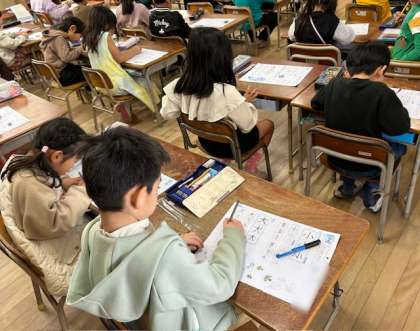 1年生が書き方「漢字のとめ、はね、はらい」を学習しました。とめ、はねに注意して「小」を、はらいに注意して「大」の漢字を書きました。