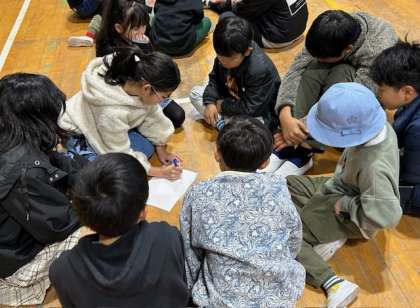 集会委員会が考えたクイズをしました。スマイル班のメンバーが輪にになり、みんなで相談して答えをホワイトボードに書きました。