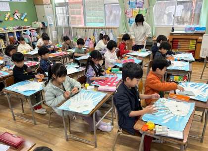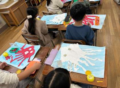 1年生が画用紙を指でちぎり、タコとイカを作り画用紙に貼りました。今日は画用紙で作った吸盤を貼り付けました。