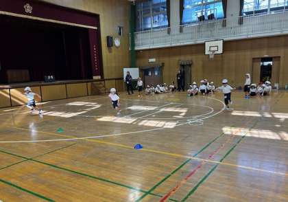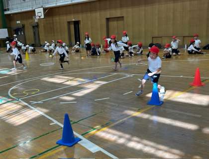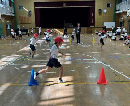 雨の影響で運動場が使えません。1年生は体育館で合同体育をしました。体育館に色々なコースを作り、素早く走る運動をしました。