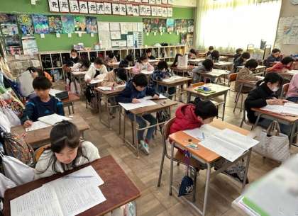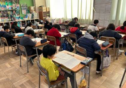 3年生が学力経年調査を実施しました。普段のテストは用紙1枚ですが、学力経年調査の問題は冊子になっています。ページをめくってたくさんの問題に取り組みました。がんばりました。