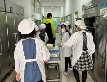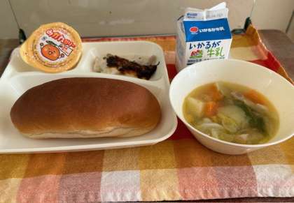 献立は、きのこのドリア、鶏肉と野菜のスープ煮、みかんゼリー、加工パン、牛乳です。給食室に食缶や牛乳などを取りに行くと、いつも給食調理員さんが支援してくれています。ありがとうございます。