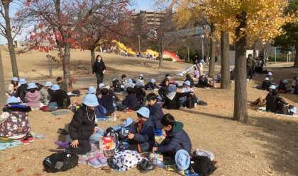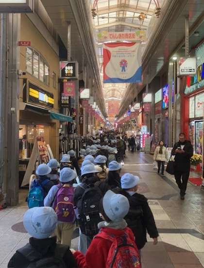 3年生がくらしの今昔館へ社会見学に行きました。扇町公園でお弁当を食べ、天神橋筋商店街を通り、くらしの今昔館に到着しました。館内では、体験活動の前に商店街の感想を書きました。