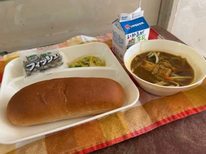 献立は、カレーうどん、はくさいのおひたし、ミニフィッシュ、黒糖パン、牛乳です。