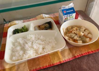 献立は、さばのおろしじょうゆかけ、五目汁、こまつなの煮びたし、ご飯、牛乳です。