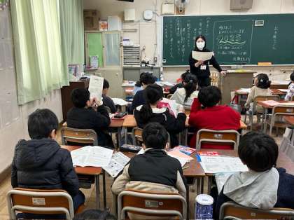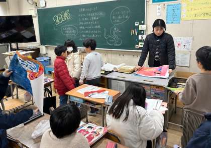 3学期がスタートしました。学年だよりを使い、行事や学習の予定を確認しました。また、冬休みの課題である図画を提出しました。黒板には担任の先生から新年のメッセージが書かれていました。