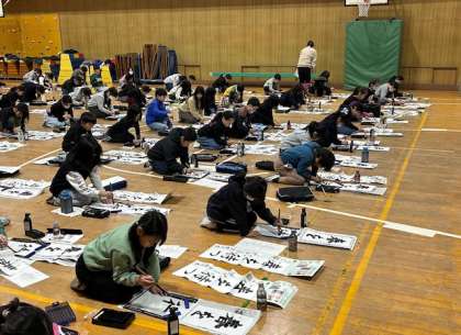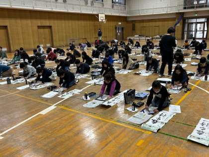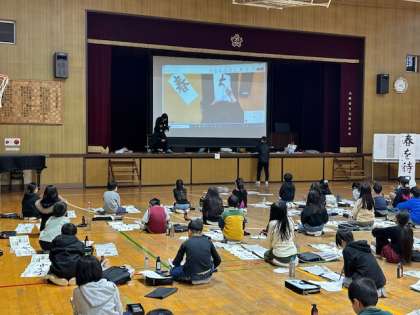 4年生が体育館で書き初めをしました。「春を待つ」を書きました。先生がお手本を示しながら、書くポイントを説明しました。みんなが集中して書きあげました。