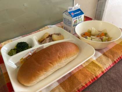 献立は、鶏肉とじゃがいものガーリック焼き、スープ煮、ブロッコリーのサラダ、みかんジャム、コッペパン、牛乳です。
