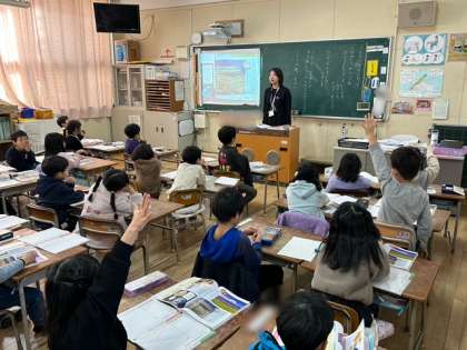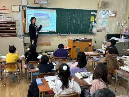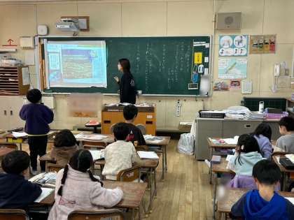 1年生が道徳「うちゅうせんにのって」を学習しました。大きな輪の海、富士山、神戸の街の写真を見て、すてきなものを見つけた時どんな気持ちになるか考えました。