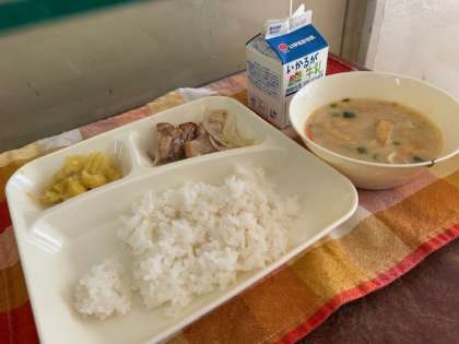 献立は、鶏肉の塩こうじ焼き、かす汁、くりきんとん、ご飯、牛乳です。