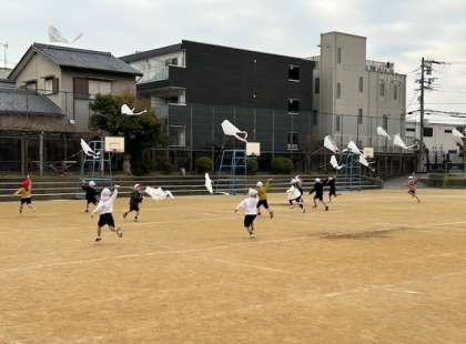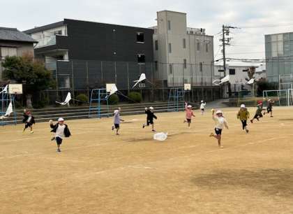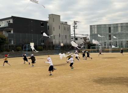 1年生が生活科の学習でたこあげをしました。たこを持って運動場を走り、風を受けてたこは空へ舞い上がりました。楽しくたこあげができました。