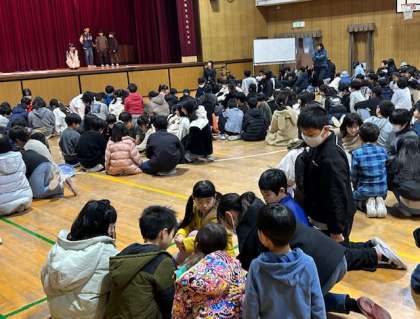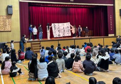 体育館で児童集会をしました。今回は、集会委員会が考えたビンゴゲームです。16マスのビンゴカードに書かれた数字をスマイル班のメンバーが覚えてカードに記入します。覚える時間は5秒間です。班のメンバーと協力しないと、16マス全てに数字を書くことができません。